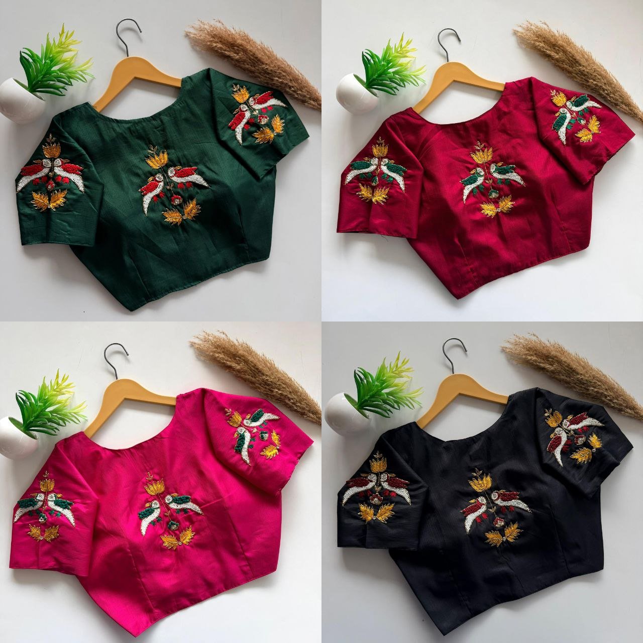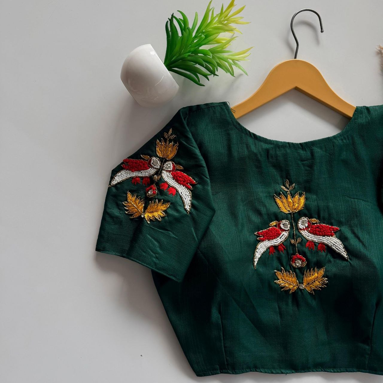 The blouse is made from high-quality haka silk, blending durability and softness for unmatched comfort. This fabric provides a luxurious texture and drape, making it perfect for pairing with sarees or lehengas during weddings or festive occasions.