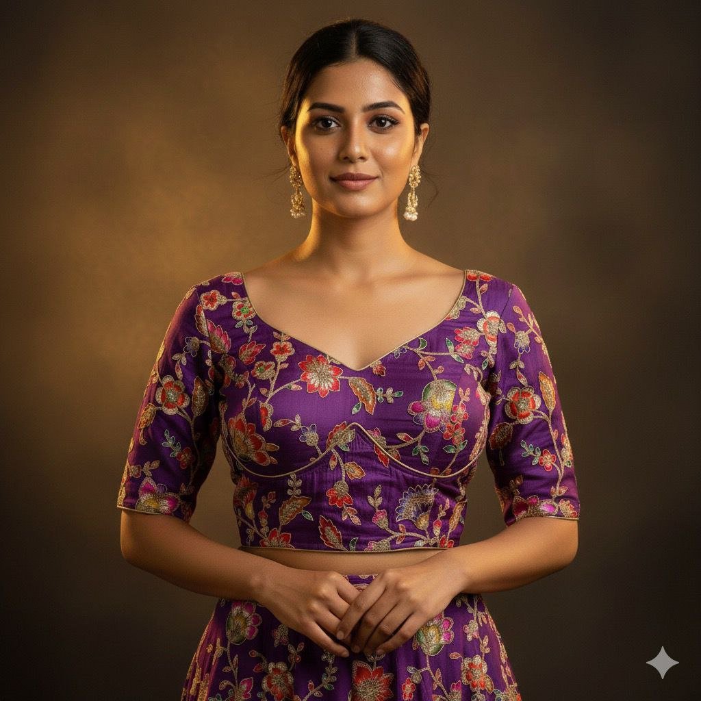Crafted from pure silk, this blouse not only feels luxurious but is also breathable and lightweight. The beautiful floral print coupled with delicate embroidery celebrates traditional artistry while embracing modern aesthetics. Whether worn with a saree or lehenga, this blouse enhances your overall look and adds a touch of elegance to any outfit.
